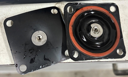 The diaphragm shown in the component on the right has become distorted and is leaking through its centre. This damage is causing the solenoid to fail to open.