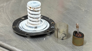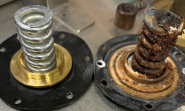 The spring on the right has corroded due to the diaphragm leaking.